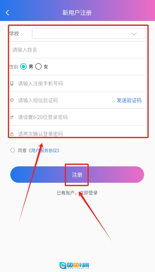 3、新用户注册流程如下:首先输入手机号获取验证码,接着填写学校、姓名、验证码等信息,最后设置密码,即可完成账号注册。
