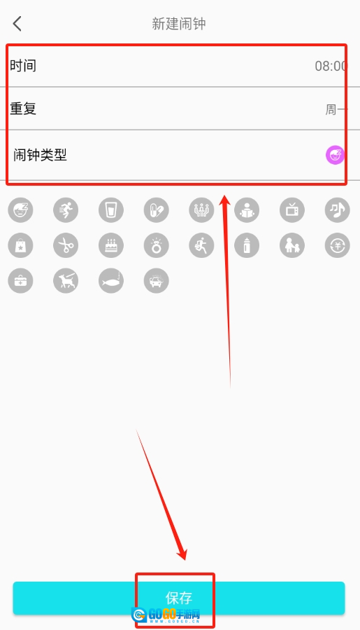 3、接下来会弹出设置窗口,按照提示依次输入你想要设定的时间,选择好是否需要重复响铃以及闹钟的类型,确认所有设置都没有问题后,点击保存按钮就可以完成操作了。