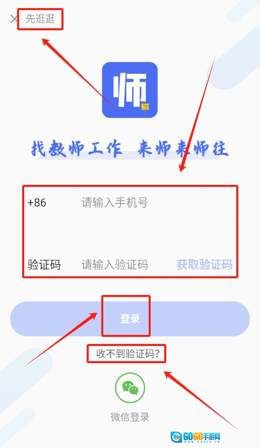 1、启动师来师往软件,进入登录界面后输入本人手机号,随后填写收到的验证码,以此完成登录流程。