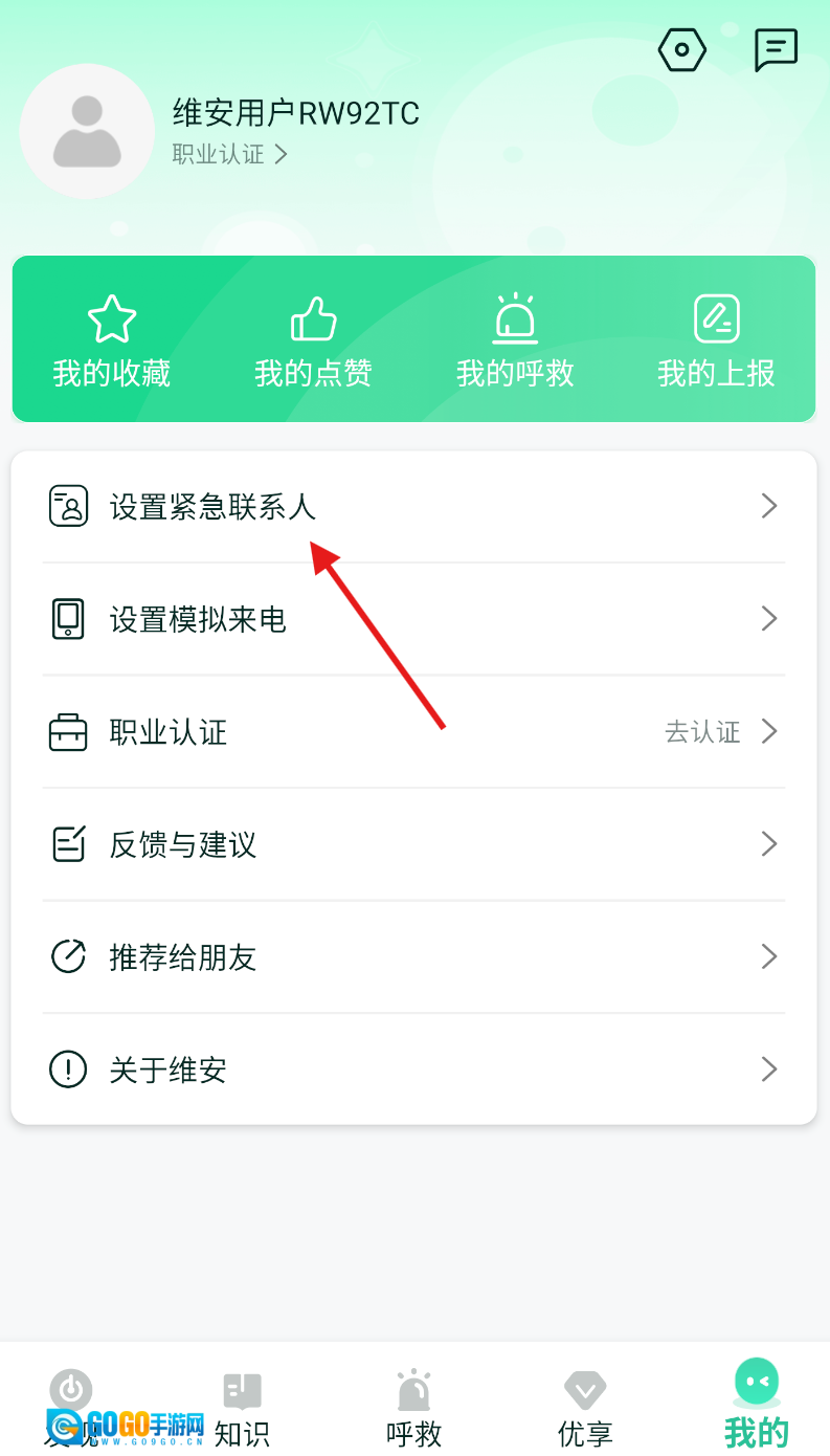 2、进入“我的”页面后,找到“设置紧急联系人”的选项,点击该选项进入添加界面。