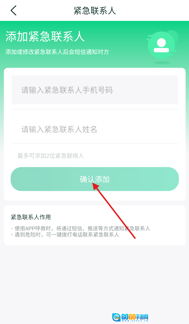3、在弹出的添加页面中,依次填写紧急联系人的姓名与电话信息,确认信息准确无误后,点击“确认添加”按钮即可完成操作。