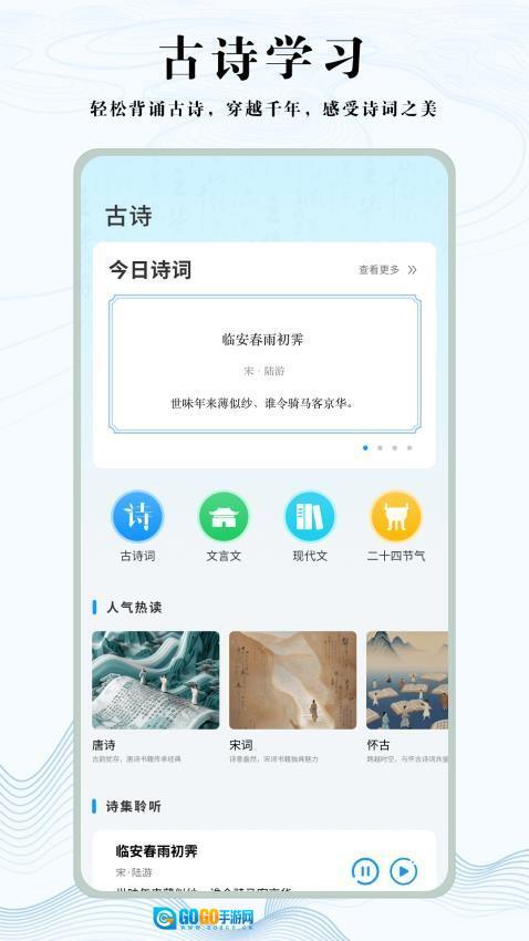2、古诗学习模块除了提供经典作品解析外,还会结合二十四节气的文化背景展开深度解读,助力用户领略诗词的韵律之美。