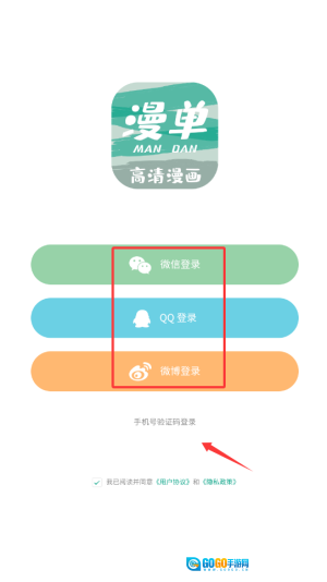 打开漫单漫画应用后,系统会自动弹出登录界面,该界面提供微信、QQ以及手机号三种不同的登录方式供用户选择。
