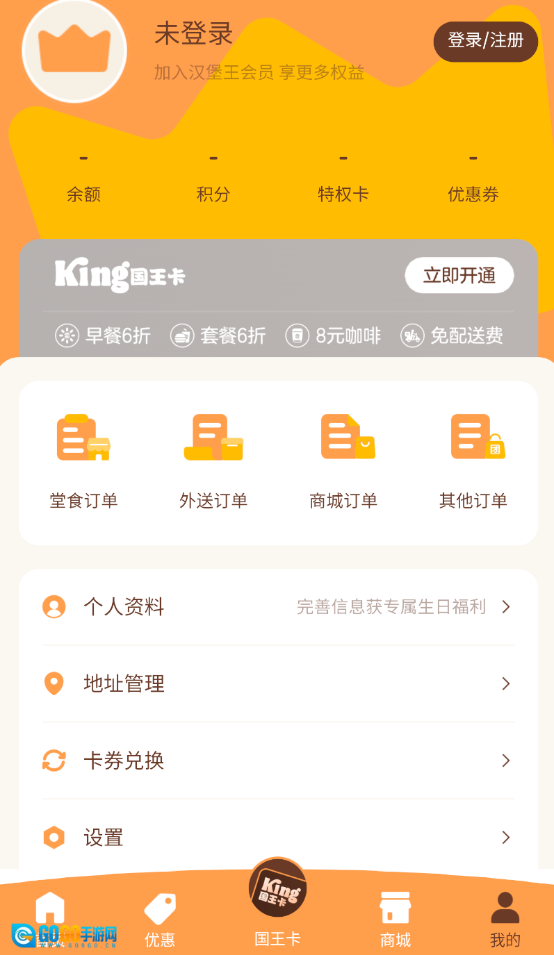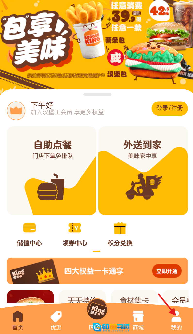 1、打开汉堡王中国应用,在主界面底部找到“我的”选项,点击进入个人中心页面。