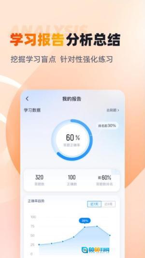 4、学习报告功能通过数据分析呈现用户的学习进度,帮助考生直观了解自己的薄弱环节,以便及时针对性调整学习计划。