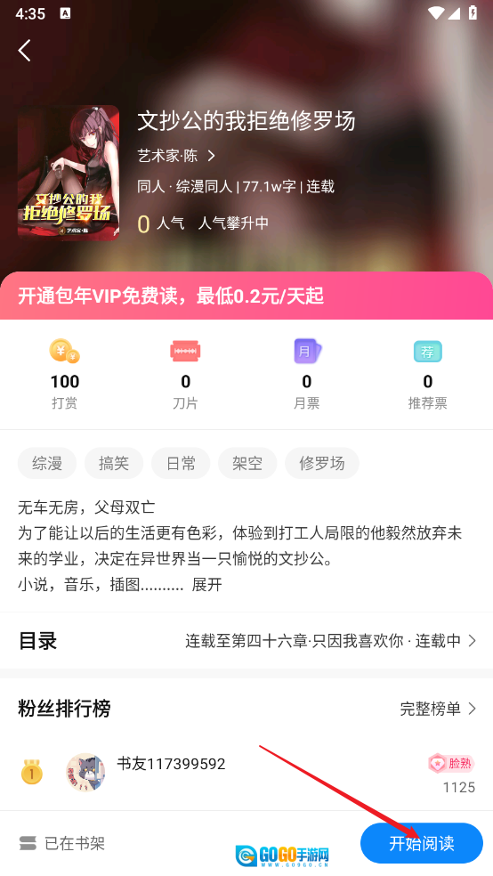 1、打开软件后,在小说阅读详情页点击“开始阅读”按钮。