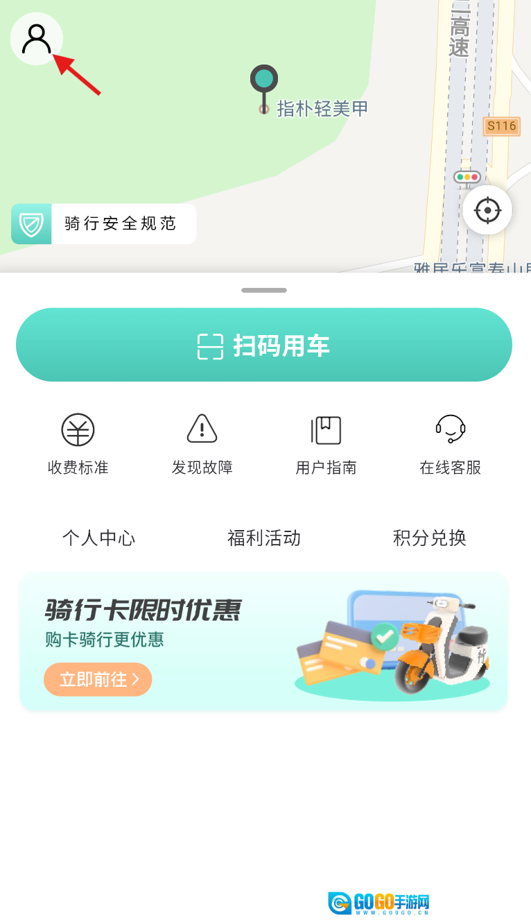 3、扫码解锁车辆:通过 地图找到附近车辆,点击扫码按钮扫描二维码,成功后即可解锁车辆。