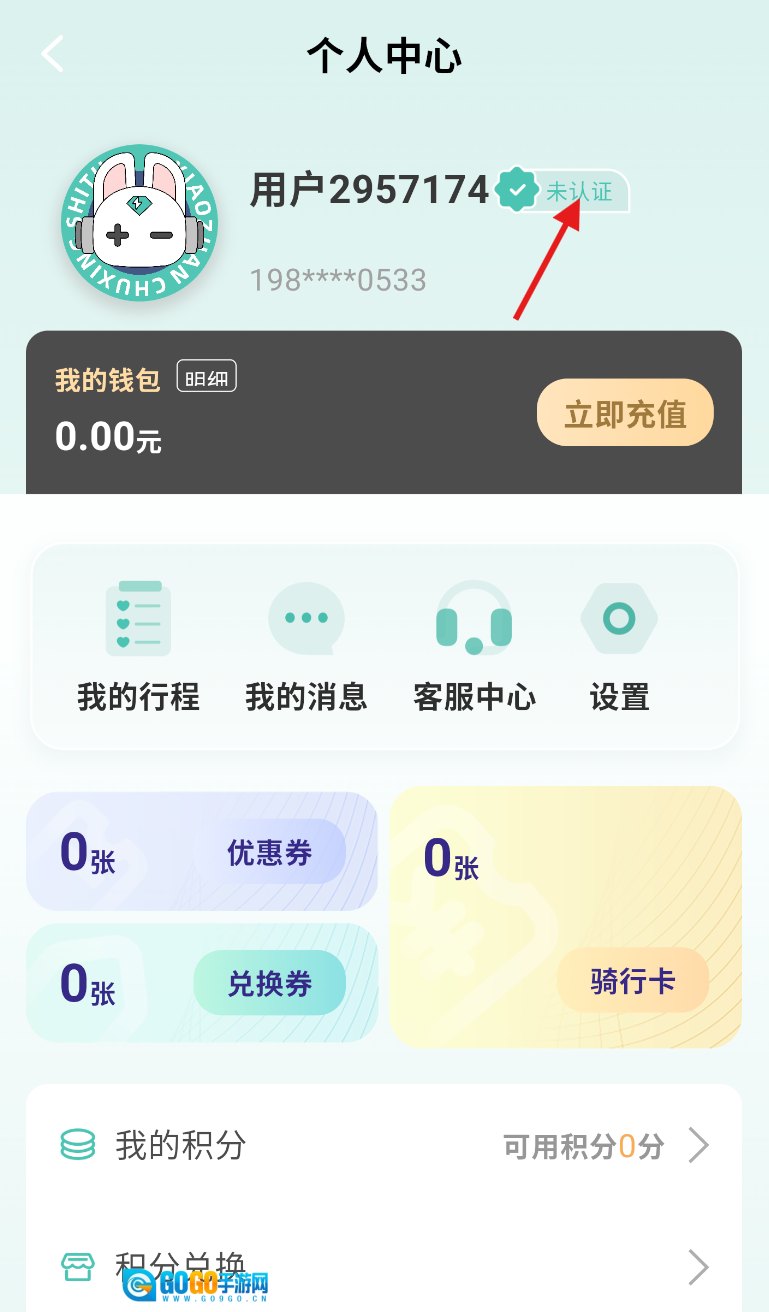 2、在个人中心里,找到用户名旁显示的 “未认证” 标识,点击进入认证入口。