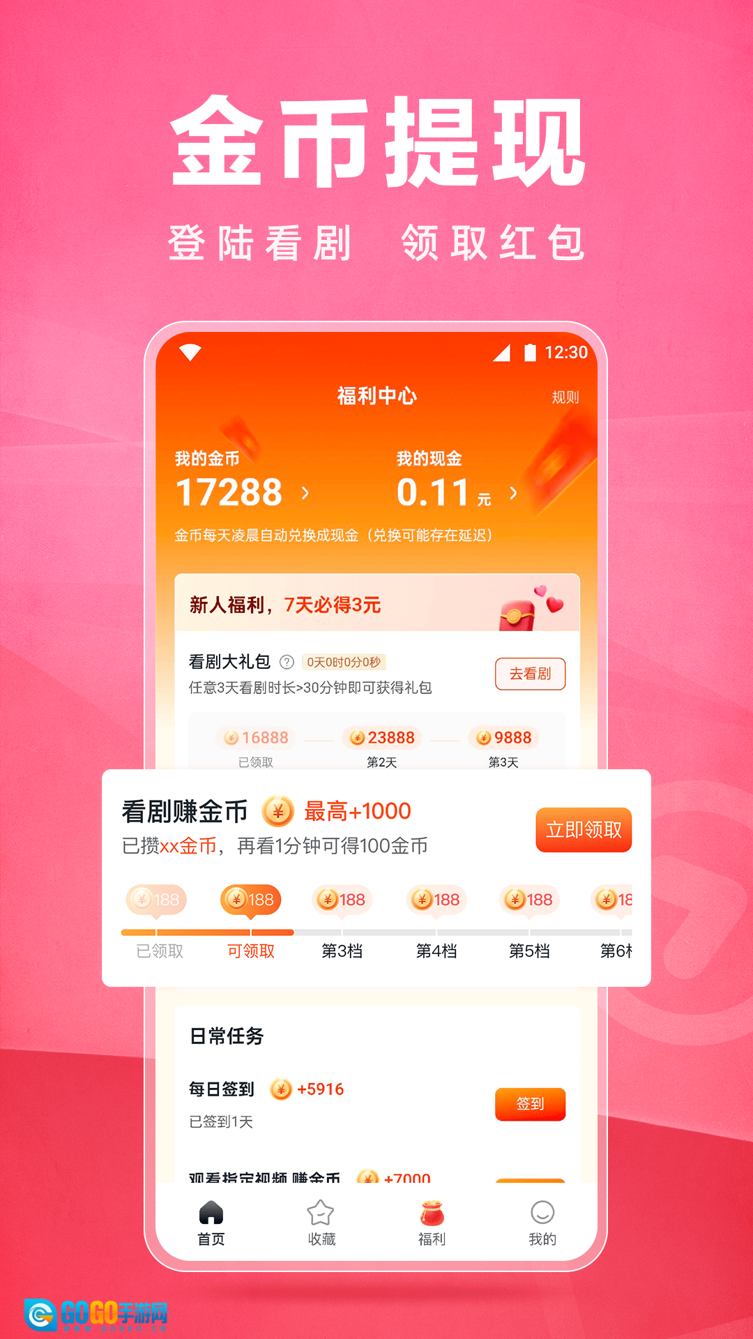 使用之后,底部会显示【首页】、【收藏】、【福利】、【我的】这些选项。