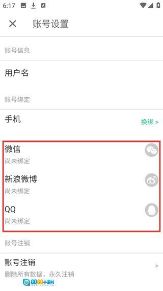 4、进入【账号设置】页面后,能看到【微信】【新浪微博】【QQ】等绑定选项,根据自身需求完成第三方账号的绑定操作即可。