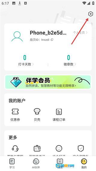 1、在扇贝伴学页面的【智能伴学】模块显示状态下,点击底部导航栏中的【我的】选项,即可进入个人相关功能页面。