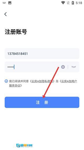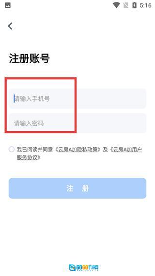 4、在【云房A加】的注册页面,填写好【手机号】与【密码】后,勾选对应的相关协议,点击【注册】按钮,就能完成账号的注册流程。