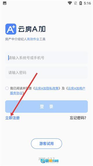 在【云房A加】的登录界面,用户既可以通过输入【系统号或手机号】与【密码】完成登录,也能选择【立即注册】或【游客试用】来启用相应的使用模式。