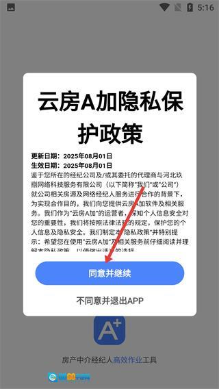 1、打开【云房A加】应用后,仔细阅读【云房A加隐私保护政策】,随后点击【同意并继续】按钮,即可进入应用的后续操作流程。