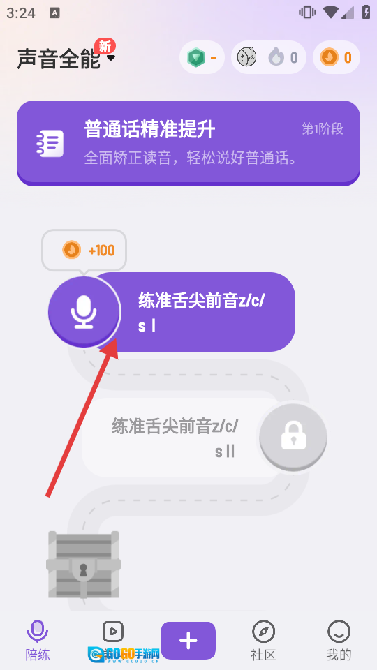 2、在陪练页面,点击【练准舌尖前音z/c/s】这一选项,即可进入对应的练习页面。