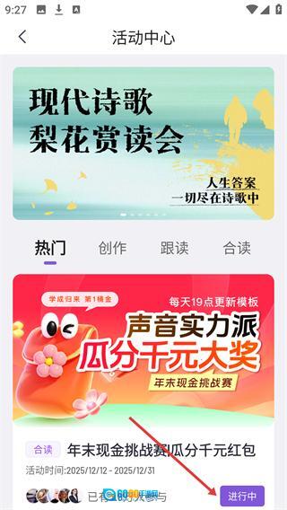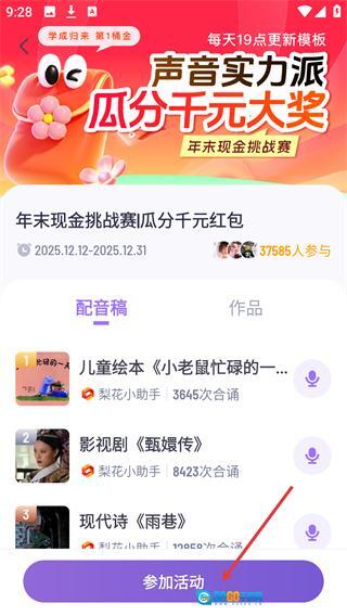 4、进入【年末现金挑战赛】的详情页面,从【配音稿】板块中挑选内容,点击页面底部的【参加活动】按钮,就能参与该活动。