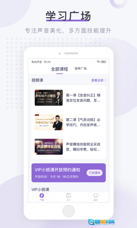 1、课程学习:可自主规划时间观看录播课程,完成场景配音作业后,48小时内会收到教师针对发音的逐句指导。