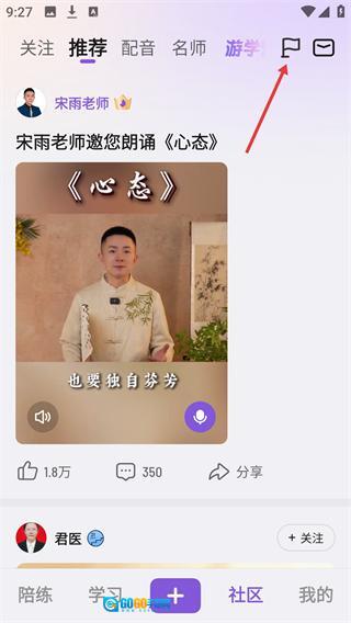 2、进入【社区】界面后,找到页面顶部带有【旗子】图标的按钮,点击该按钮即可进入【活动中心】。