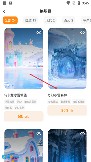 3、进入【换场景】页面后,挑选你想要的目标场景,比如【奇幻冰雪森林】。