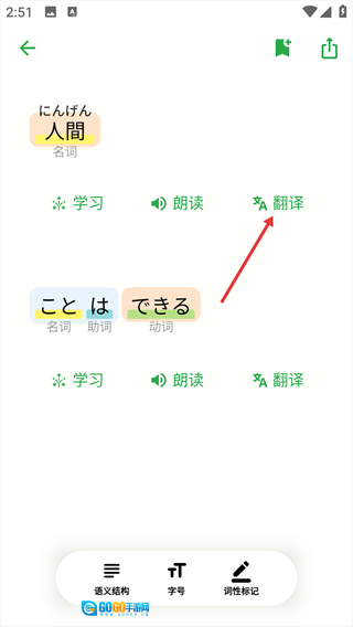 4. 中日双语对照学习,每个日文词汇的中文含义都能直接在此查看。