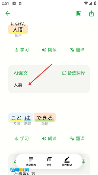 4、页面会展示对应内容的译文,例如【人間】所对应的译文是【人类】。