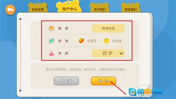在信息编辑页面,能够修改【昵称】、选择【性别】、调整【年龄】,操作完成后点击【保存】按钮,所做修改就会生效。