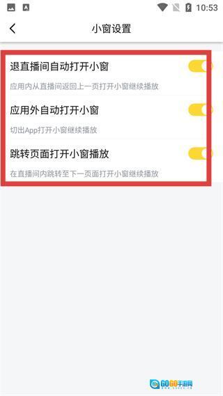 4、进入小窗设置页面,把【退出直播间自动开启小窗】这类开关关闭,就能停用小窗口模式了。