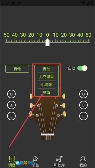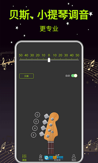 3、切换至【贝斯】乐器后,界面将呈现【G】-【D】-【A】-【E】弦的选项,能够对应贝斯的琴弦开展精准调音操作。