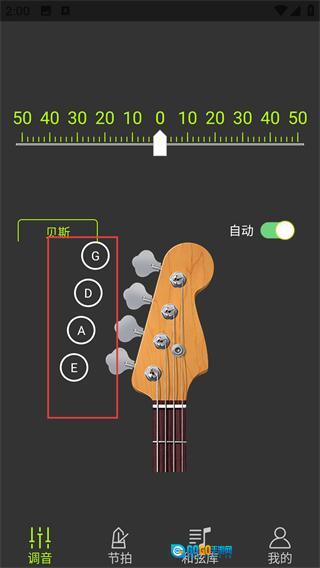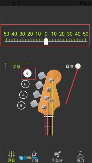 4、进入贝斯调音界面后,点击右侧的【自动】开关将其打开,就能启用自动调音功能,借助【G】弦等标识可以提高调音效率。