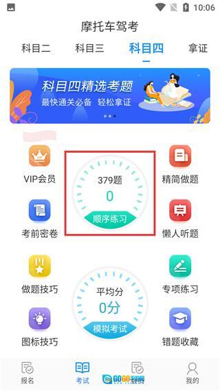 1、进入【摩托车驾考】界面后,点击顶部的【科目四】选项卡,即可切换到科目四的练习板块。