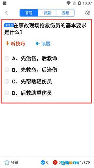 4、进入科目四答题页面后,在作答【单选题】的过程中,可以利用【听技巧】和【读题】这两个功能;当前显示的是【1/379】题,完成该题后能够继续切换到下一道题目。