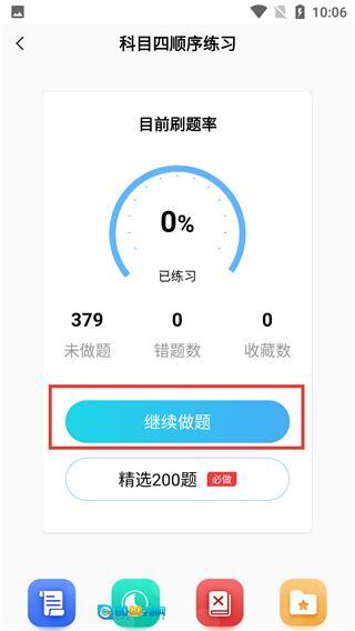 3、进入【科目四顺序练习】页面后,点击【继续做题】按钮,即可开始科目四的题目练习。
