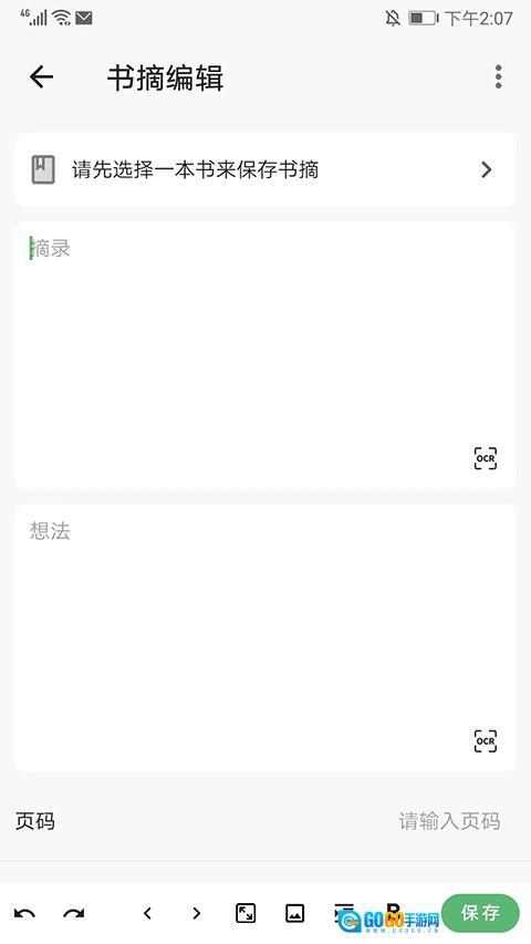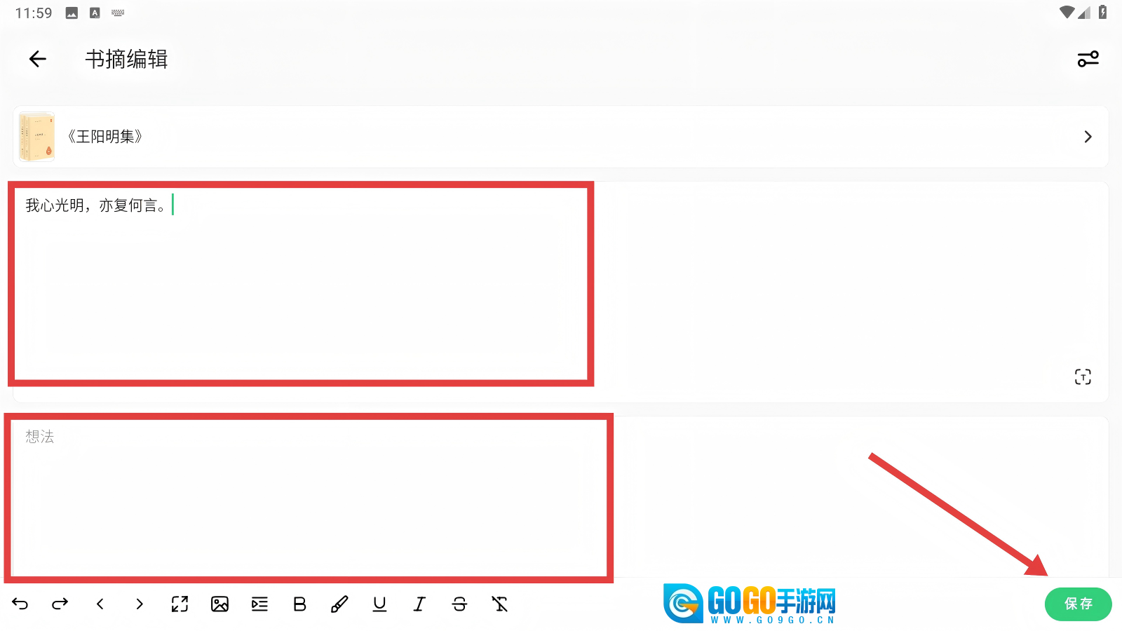 4、进入书摘编辑界面后,填写书摘内容与个人想法,例如“我心光明,亦复何言”这样的语句,全部完成后点击“保存”按钮就可以了。