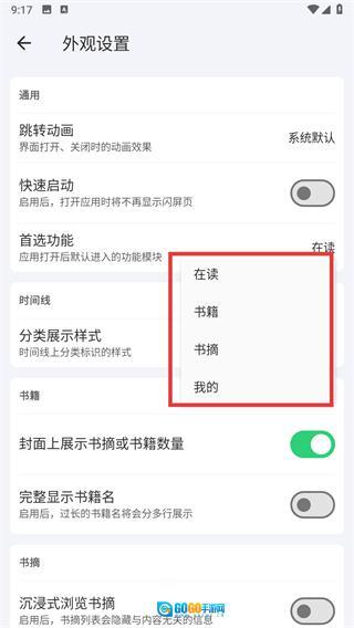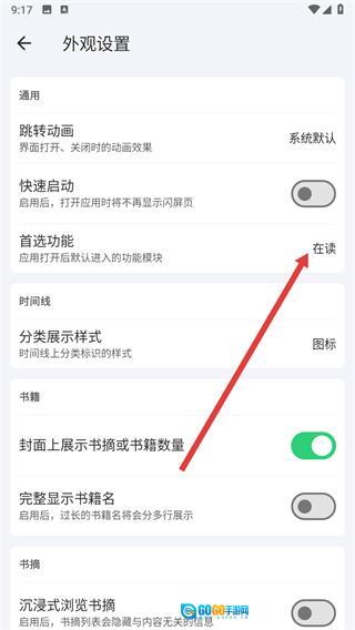 3、进入外观设置页面后,找到首选功能选项,点击该选项右侧的“在读”按钮。