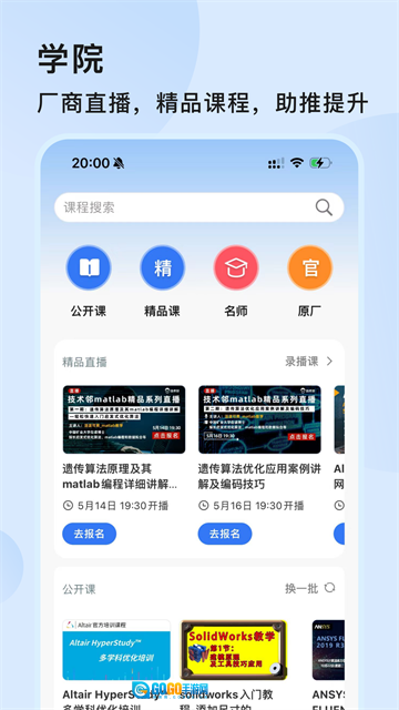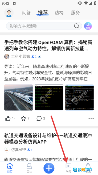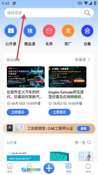 1、在推荐页面,点击底部的【学院】按钮,进入课程搜索界面。