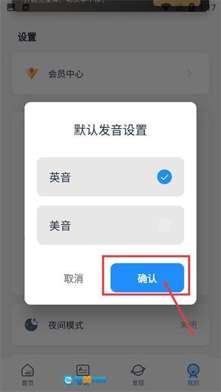 4、打开【默认发音设置】弹窗,选择其中的【英音】选项,再点击【确认】按钮,就能把默认发音切换成英音了。