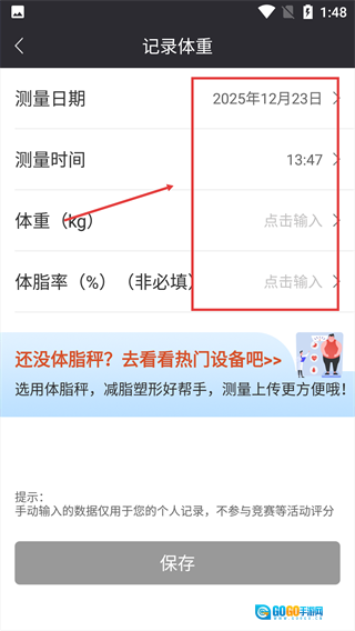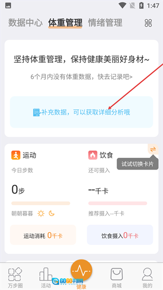 2、点击【补充数据,即可获取详细分析】区域,进入体重数据操作页面。