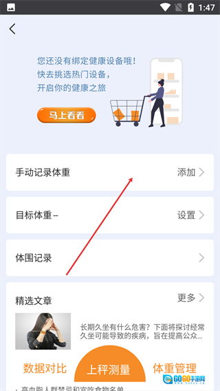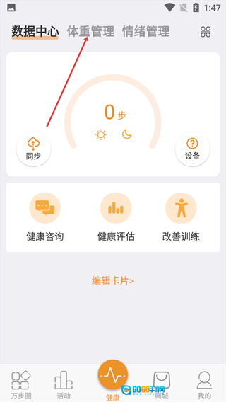 1、进入健康页面后,点击页面顶部的【体重管理】选项,即可切换到体重管理功能页面。
