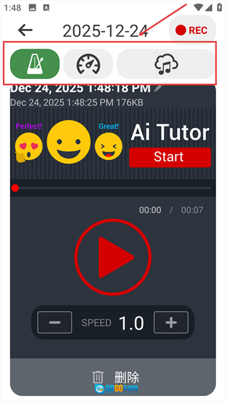 在录制文件管理界面,可借助顶部功能栏切换节拍器、测速等工具。