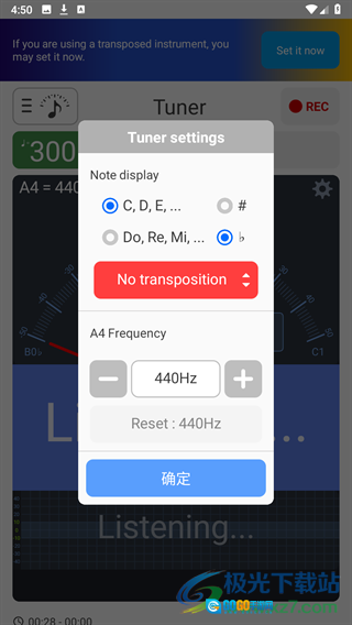 3、点击调音器右上角的齿轮图标进入设置界面,在该界面中可对调音器的各项设置进行修改。