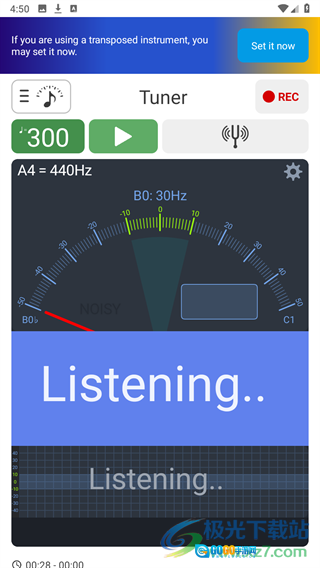 2、进入调音器界面后,通过观察箭头的位置来进行调音操作,箭头向左表示当前音偏低,箭头向右则表示当前音偏高。