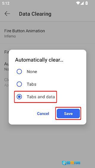 3、点击“automatically clear”选项,选择“tabs and data”,然后点击“save”按钮