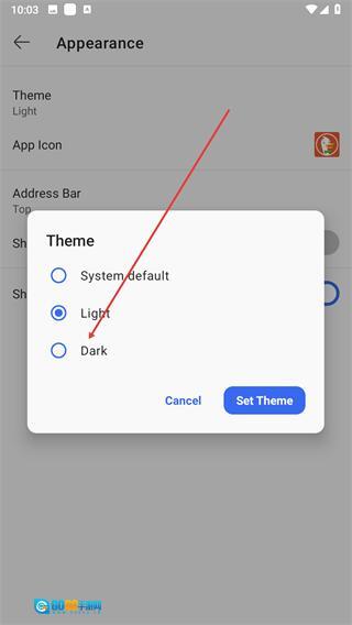 5、选择Dark选项并点击Set Theme,即可完成深色模式的切换。