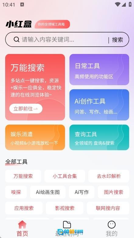 小红盒是一款集日常工具、万能搜索、去水印解析、嗅探、影视搜索、音乐搜索、应用搜索、AI写作、AI绘画生图等多种功能于一身的万能工具箱软件。该软件内的所有功能均可免费使用,能够全方位满足您的各类使用需求。