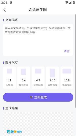 3、进入创作页面后,填写文本描述相关内容,选择合适的图片尺寸,点击“立即生成”按钮即可。