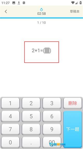 4、进入练习题目页面后,若遇到类似【2+1=】这样的题目,可借助数字键盘输入答案,完成输入后点击【下一题】按钮继续进行练习。