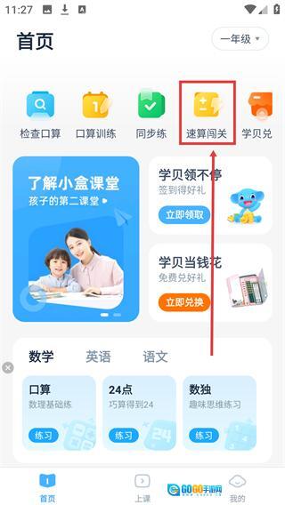 1、在首页找到并点击【速算闯关】的功能入口,即可进入速算闯关的学习界面。
