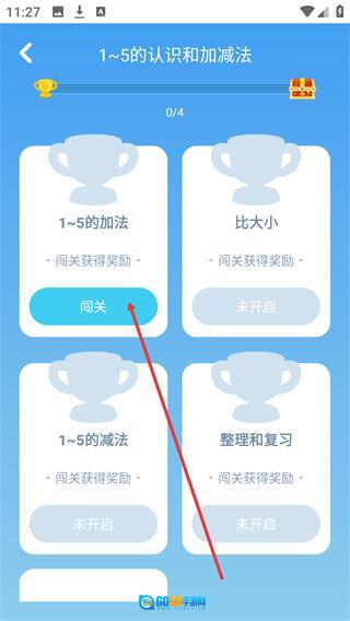 3、在【1~5的认识和加减法】页面,找到【1~5的加法】选项,点击【闯关】按钮就能开始该部分的练习。