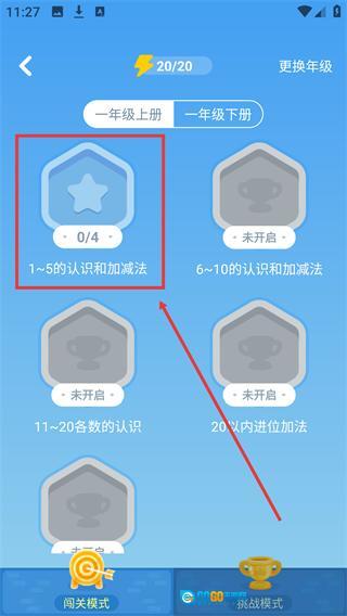 进入速算闯关页面后,找到【1~5的认识和加减法】模块(当前进度显示为0/4),点击该模块就能进入对应的细分练习页面。