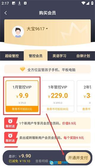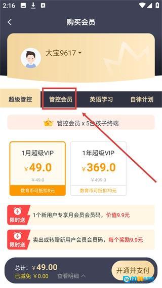 4、在【管控会员】分类中选择【1月管控VIP】套餐,接着点击【开通并支付】按钮,就能完成该会员套餐的购买操作。